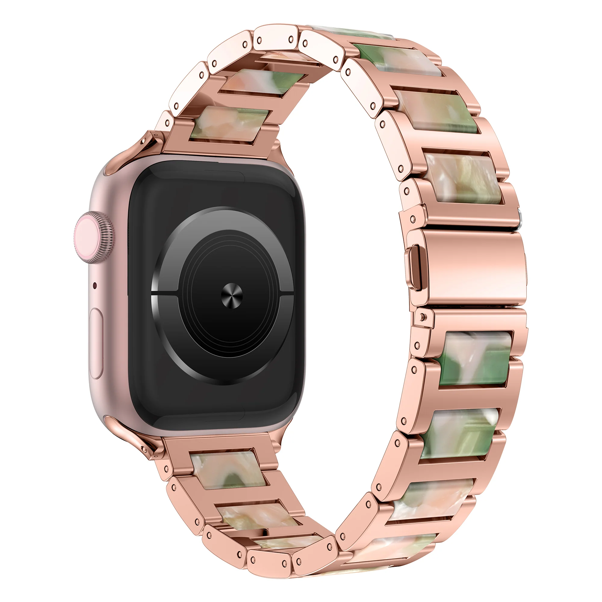 Dieses Armband aus hochwertigem Edelstahl mit eingefassten Kunstharzelementen passt sich dem Design der Apple Watch super an und bildet das perfekte Komplettpaket.