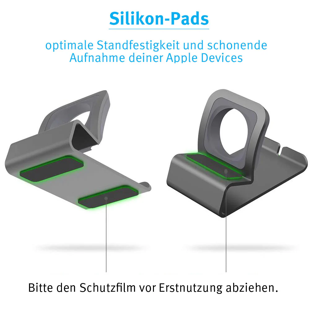 Der Apple Watch Ständer ist an diversen Stellen mit Silikonpads ausgestattet, was für optimale Standfestigkeit und eine schonende Aufnahme deiner Apple Watch inklusive Ladekabel sorgt.