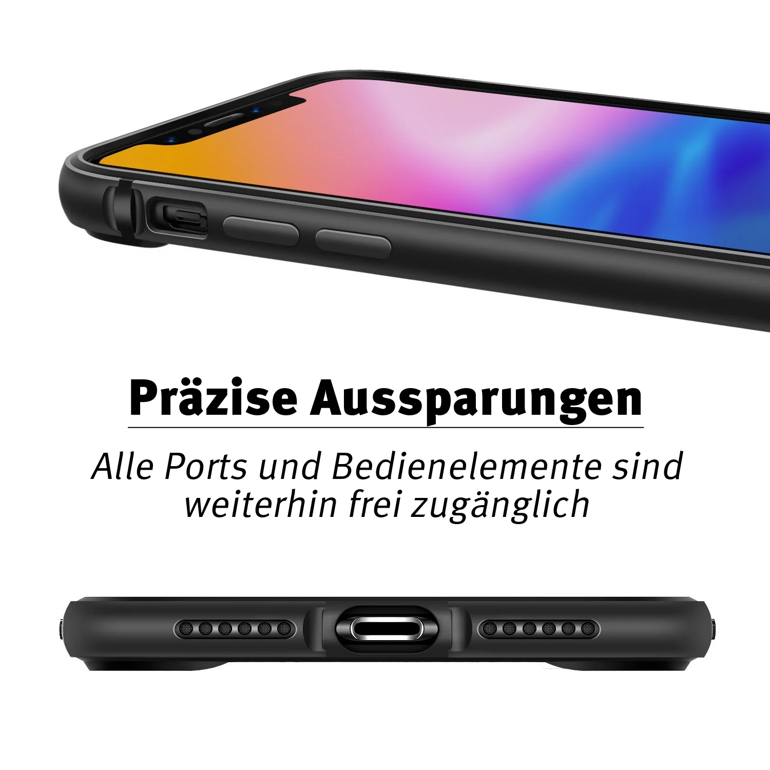 - Bumper steht an allen 4 Ecken 2 mm über und verhindert so ein direktes Aufliegen von iPhone Rücken und Kamera