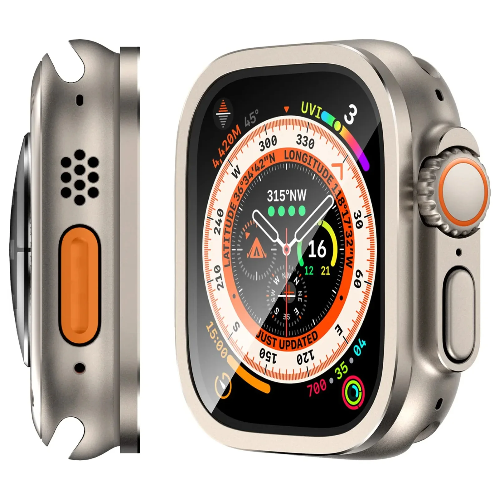 Das extra gehärtete Glas ist mit einem hochwertigen Rahmen aus einer Titanlegierung eingefasst, der die erhöhte Displayplattform der Apple Watch Ultra ummantelt und diese gezielt vor äußeren Einwirkungen schützt. Der Rahmen ist titanfarben und verschmilzt daher geradezu mit dem Apple Watch Ultra Gehäuse.